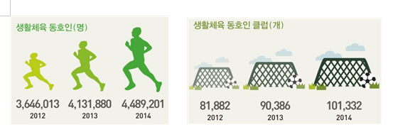 이러한 현실 속에서 스포츠 참여 인구는(프로스포츠 관중 및 생활체육 참여자 등 포함) 비약적으로 증가하고 있다. 2012년부터 2014년에 이르기까지 생활체육관련 참여인의 수 및 동호인 클럽의 변화를 나타낸 아래 그림은 이러한 흐름을 잘 보여주고 있다.