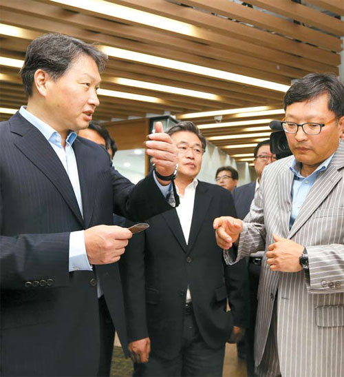 최 회장은 이날 오전 10시께 카이스트 나노종합기술원 9층의 대전센터에 도착해 내부 시설과 입주 벤처기업들이 개발 중인 시제품을 둘러봤다.