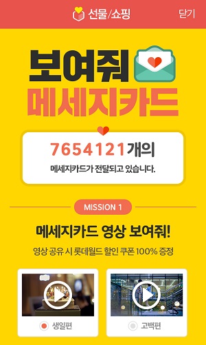 22일까지 카카오톡 선물하기에 공개된 메시지카드 영상을 카카오톡 또는 카카오스토리에 공유한 이용자 전원에게 롯데월드 할인 쿠폰을 증정한다.