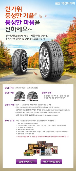 넥센타이어(대표 이현봉)는 추석을 앞두고 구매 고객 사은 이벤트를 벌인다고 10일 밝혔다.