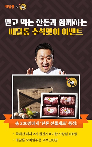 유쾌한 배달음식 문화를 지향하는 배달통(대표 나제원)은 한돈자조금관리위원회(위원장 이병규)와 함께 추석맞이 한돈 선물세트 증정 이벤트를 진행한다고 15일 밝혔다.