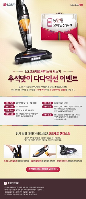 LG전자는 해당 고객에게 5만원 모바일 상품권을 증정할 계획이다. 행사모델은 코드제로 핸디스틱 6종(▲S84CI ▲VS7300SCW ▲VS7301SCW ▲VS7302SCW ▲VS7303SCW ▲VS7304SCW)이다. 자세한 내용은 LG전자 홈페이지에서 확인할 수 있다.