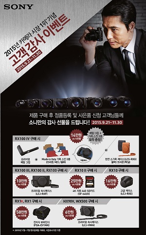 소니코리아는 2015년 상반기 국내 하이엔드 카메라 및 전체 렌즈일체형 카메라 시장 판매 1위 동시 달성을 기념해 소니의 프리미엄 하이엔드 카메라 구매 고객을 대상으로 정품 등록 프로모션을 21일부터 11월 30일까지 진행한다.