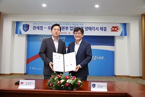 우정사업본부 김기덕 본부장(왼쪽)과 관세청 이돈현 차장이 23일 서울세관에서 국제 전자상거래 활성화와 수출기업 무역편의 제공을 위한 업무협력 양해각서를 체결하고 있다.