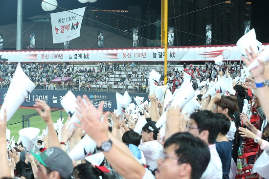 KT(회장 황창규)는 24일 수원 kt wiz park에서 ‘대한민국 통신 130년’을 기념하는 고객 이벤트와 그룹 임직원들이 참여한 대규모 응원전을 성황리에 진행했다고 밝혔다.