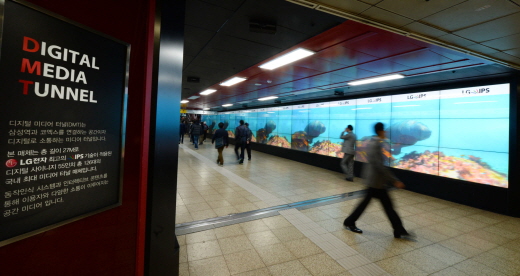 ‘디지털 미디어 터널’은 삼성역과 코엑스를 연결하는 통로에 있는 초대형 사이니지다. 이 광고판은 길이가 27m이며 LG전자 55형 IPS 사이니지 126대로 제작됐다.