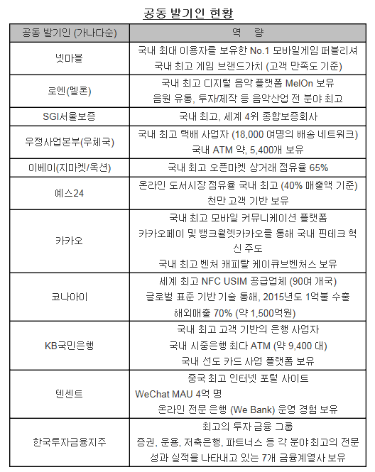 한국투자금융지주, KB국민은행, 카카오 외에 넷마블, 로엔(멜론), SGI서울보증, 우정사업본부(우체국), 이베이(지마켓, 옥션), 예스24, 코나아이, 텐센트 등 총 11개사가 공동 발기인으로 참여한다.