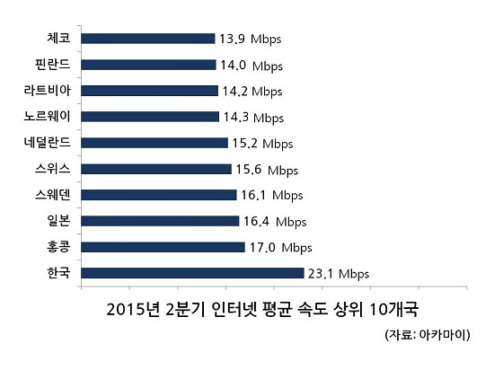 홍콩(17.0Mbps)과 일본(16.4Mbps)이 각각 2위와 3위를 차지했다. 2015년 2분기 전세계 인터넷 평균 속도는 5.1Mbps로 전년 동기 대비 17% 빨라졌다.