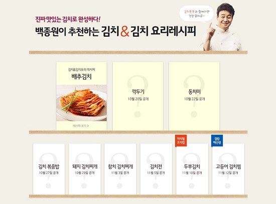 배추김치를 시작으로 깍두기, 동치미부터 두부김치, 고등어 김치찜까지 다채로운 김치요리 레시피들을 향후 한 달 간 주 2회씩 공개해 나갈 예정이다. 백종원이 김치에 대한 자신만의 노하우를 요리 초보자도 쉽게 따라할 수 있는 조리법으로 전달해 기대를 모은다.