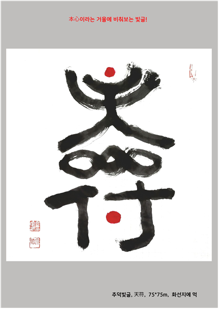 이 빛글作 天符에서는 天의 위쪽 두 가로획이 위로 둥글게 휘어지면서 하늘을 향했고 가운데에 붉은 점을 더해서 3원의 형태를 잡았다.