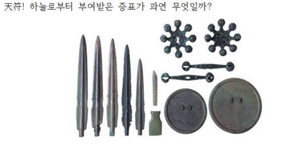 청동으로 된 검, 거울, 방울 세 가지를 하늘의 증표로 설명하는 것이 주류학자들의 주장인데, 그렇다 치더라도 이 세 가지 신물(信物)이 현재시점에서 우리에게 주는 가르침과 메시지를 새로 의미부여할 수는 없을까?