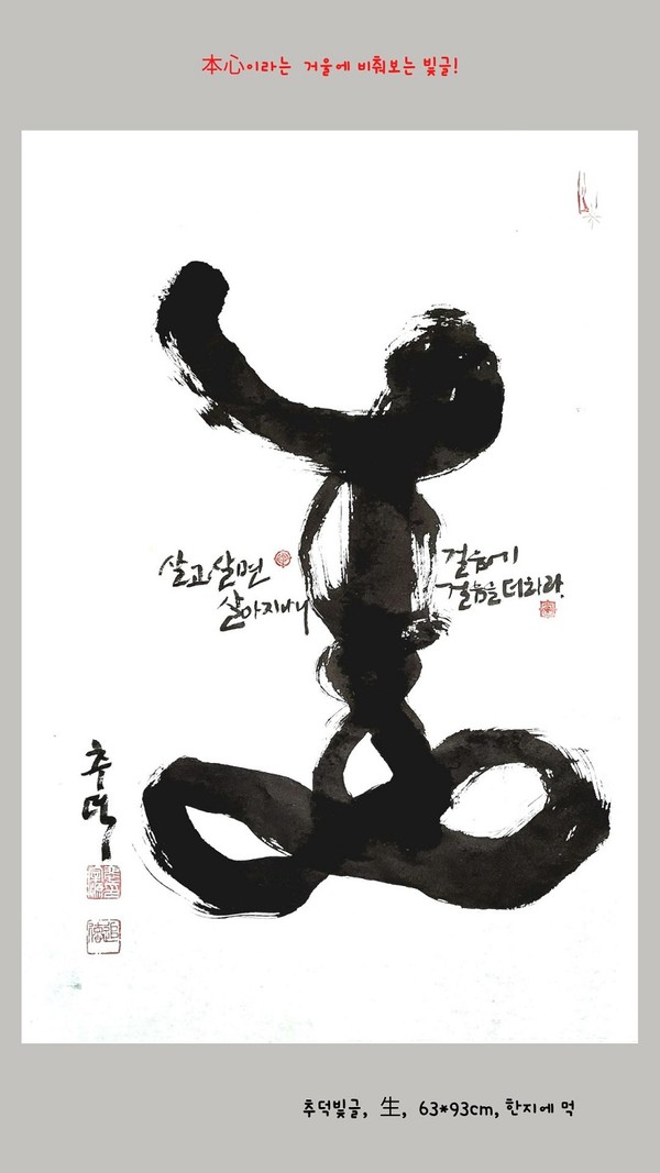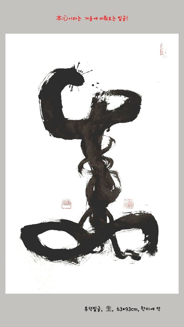 빛글 ‘生’이 글자字의 고유한 틀을 갖춘다는 것은 지금까지 이런 류의 자형(字形)이 없었다는 것입니다. 기(氣)의 흐름대로 획의 뼈대가 만들어지고 출렁이며 흐르는 혈맥(血脈)이 연결되고 어울려서 고유의 정체성을 확보하게 됩니다.