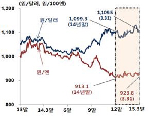 한국은행이 16일 발표한 '2015년 1분기 중 외환시장 동향' 자료에 따르면 분기중 평균 원·달러 환율은 1100.3원으로 전분기(1087.1원)에 비해 13.2원 상승(1.2% 절하)했다.
