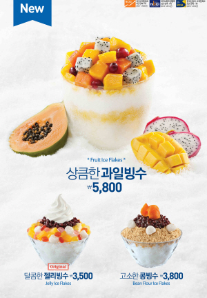 빙수 3종은 과일 젤리와 아이스크림이 들어간 '젤리빙수'(3500원), 콩가루 찹쌀떡 등으로 맛을 낸 '콩빙수'(3800원), 열대과일과 망고 시럽을 넣은 '과일빙수'(5800원) 등이다.
