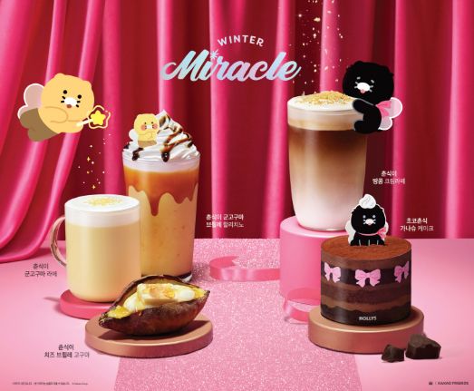 콜라보레이션 메뉴는 고구마와 초콜릿을 활용해 음료 3종과 디저트 2종 등 총 5종으로 선보인다. 음료 3종은 ▲춘식이 군고구마 라떼 ▲춘식이 군고구마 브륄레 할리치노 ▲춘식이 땅콩 크림라떼, 디저트 2종은 ▲춘식이 치즈 브륄레 고구마 ▲초코춘식 가나슈 케이크다.