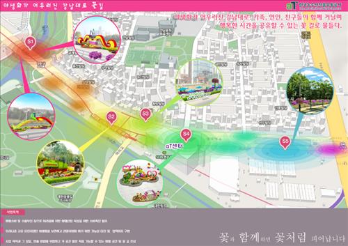 10월까지 6개월간 영동1교부터 염곡4거리에 이르는 강남대로 약 1.7㎞ 구간에 페츄리아, 멜라포디움, 제라늄, 메리골드 등 꽃 총 2만5천송이로 조성한 꽃길을 운영한다.