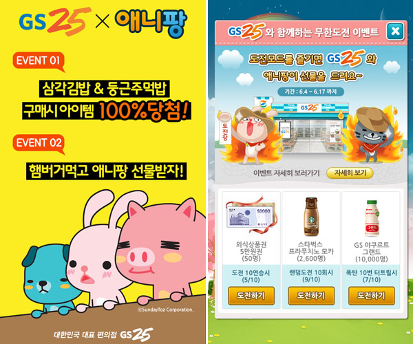 '애니팡' 개발사인 선데이토즈는 편의점 GS25를 운영하는 유통사 GS리테일과 함께 게임 쿠폰 증정 이벤트를 진행한다고 2일 밝혔다.