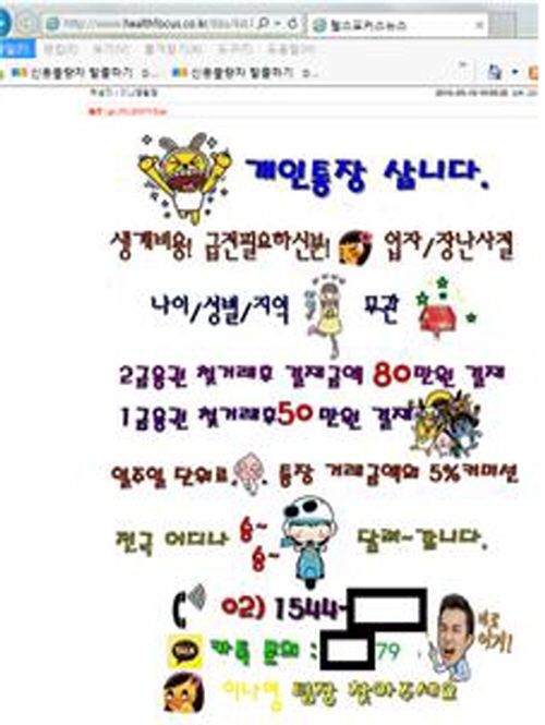 인터넷상에서 대포통장매매 광고가 버젓이 돌아다니고 있는 것으로 나타났다. 금융당국은 불법행위를 조장·알선하는 광고를 발견하는 경우 적극 신고해 달라고 당부했다.