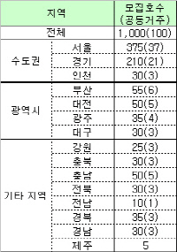 모집 유형은 단독거주 형태가 900가구, 대학생 2∼3명이 같이 사는 공동거주 형태가 100가구이며 지역별 공급 물량은 수도권이 615가구, 지방 광역시 170가구, 기타 215가구 등이다.