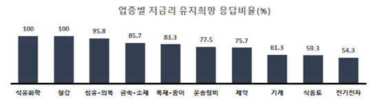 업종별로는 대규모 장치산업인 석유화학(100%)과 철강(100%) 업종의 응답기업은 예외없이 저금리 기조 유지를 주문했다. 섬유·의복(95.8%), 금속·소재(85.7%), 목재·종리(83.3%), 운송장비(77.5%), 식음료(59.3%), 전기전자(54.3%) 순으로 저금리 기조를 희망했다.