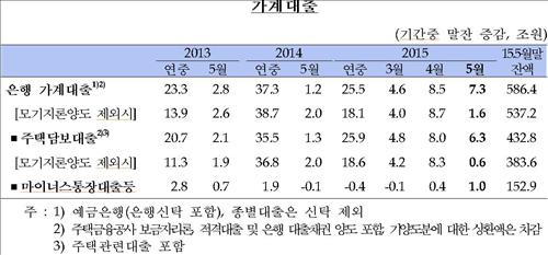 한국은행이 10일 발표한 '5월 중 금융시장 동향'에 따르면 지난달 말 현재 은행권의 가계대출(모기지론 양도 포함) 잔액은 586조4000억원으로 한 달 전보다 7조3000억원 늘었다.