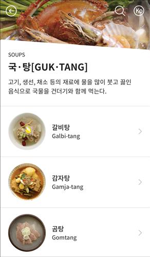 갈비탕에 대해 '핏물을 뺀 소갈비를 무와 함께 푹 끓인 음식으로, 맑은 국물이 구수하고 갈비를 뜯어 먹는 맛이 쏠쏠하다'는 설명이 3개 국어로 나와 있다.