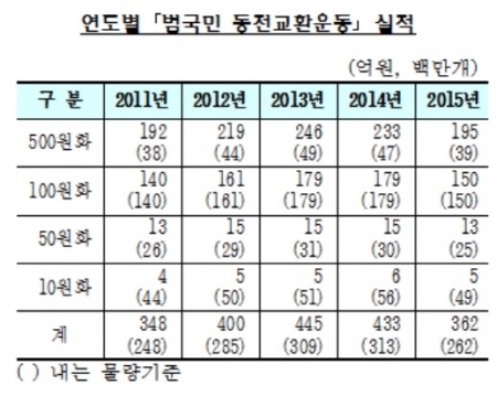 한국은행은 5월 한 달간 펼친 범국민 동전교환 운동으로 총 2억6천200만 개(362억 원어치)의 동전이 지폐로 교환됐다고 15일 밝혔다.
