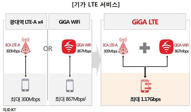 KT는 3CA LTE와 기가 와이파이를 하나의 통신망처럼 묶어 기존 LTE보다 15배, 3CA보다 4배 빠른 최대 1.17Gbps의 속도를 낼 수 있는 기가 LTE 서비스를 상용화해 5세대(5G) 이동통신 시대 실현을 위한 교두보를 확보했다고 15일 밝혔다.