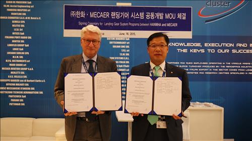 한화에 따르면 16일(현지시간) 프랑스 파리에어쇼 현장에서 글로벌 항공기 랜딩기어 전문업체인 미카에르(Mecaer Aviation Group1)사와 랜딩기어 시스템 분야 국제공동개발에 관한 양해각서(MOU)를 체결했다.