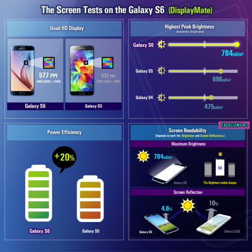 평가기관의 보고서는 갤럭시S6의 아몰레드가 577ppi(1평방인치당 픽셀수)의 고해상도, 소비전력, 야외시인성 등에서 전작인 갤럭시S5는 물론 불과 반년 전에 출시된 갤럭시노트4의 성능을 뛰어넘었다고 평가했다.